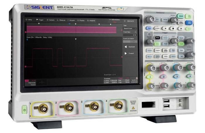 Осциллограф АКИП-4134 с полосой пропускания 350 МГц. Максимальная частота дискретизации составляет 5 ГГц, Разрядность АЦП по вертикали составляет 8 бит (до 11 бит в режиме увеличенного разрешения ERes). В осциллографе реализована усовершенствова...