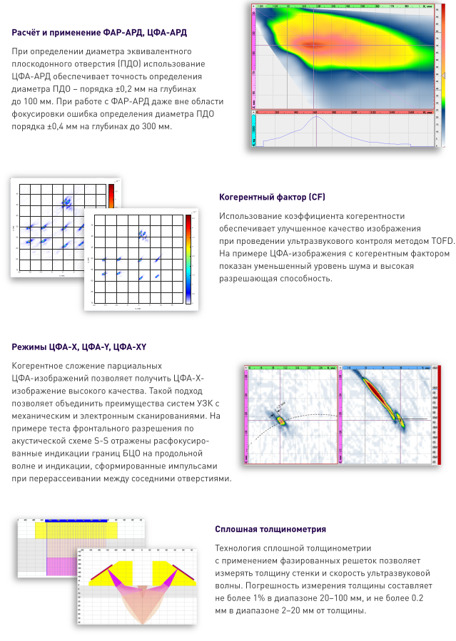 - Поддержка широкого спектра технологий: ФАР, TOFD, ЦФА, зональный контроль