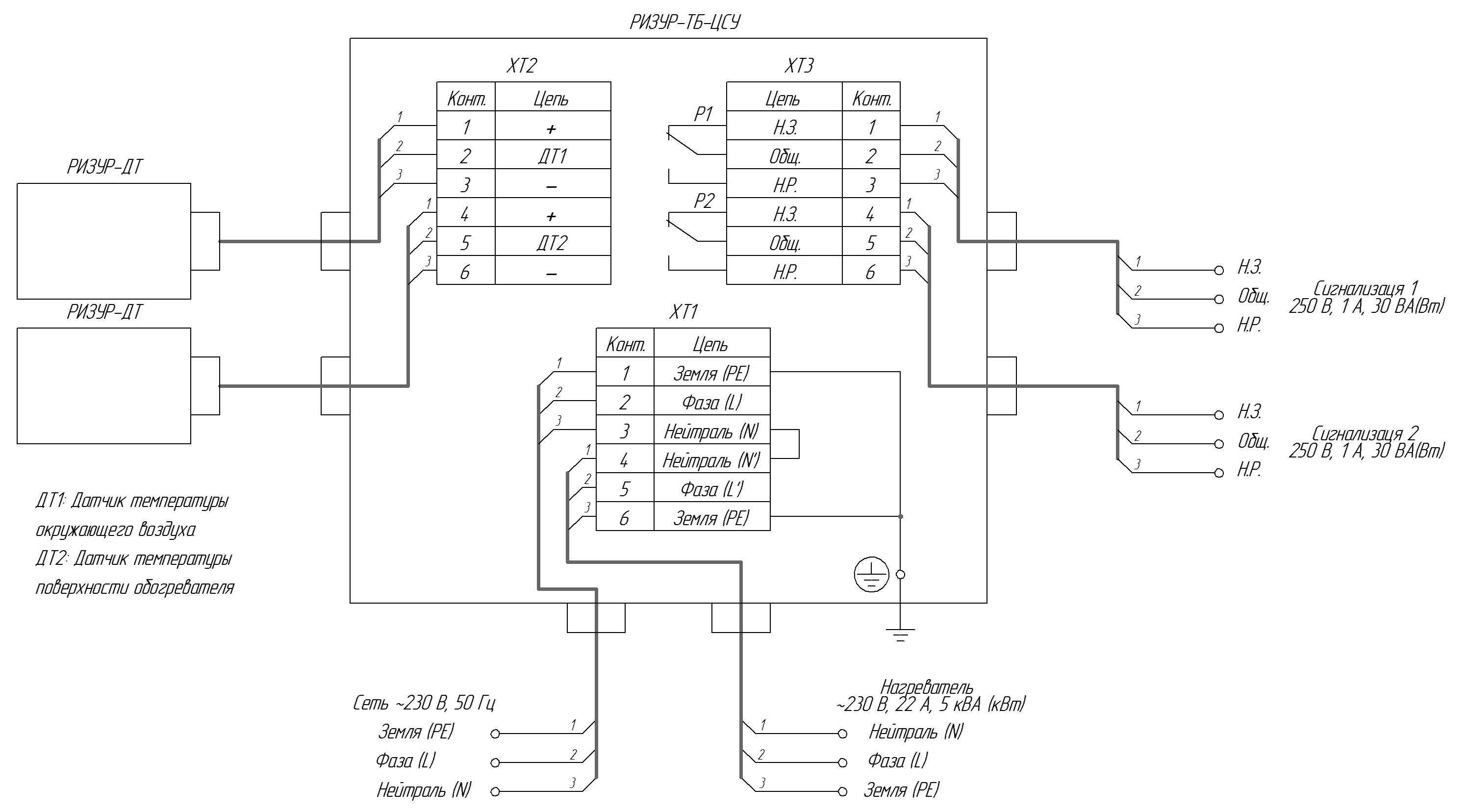 Для сигнализации повышения/понижения температуры выше/ниже заданных предельных температурных уставок терморегулятор РИЗУР-ТБ-ЦСУ оснащен дополнительными релейными выходами, а также, в зависимости от исполнения, аналоговым выходным сигналом 4-20мА. Корпус терморегулятора также выполняет функцию соединительной коробки, то есть внутри корпуса расположен клеммный блок, а на корпусе размещены взрывозащищенные кабельные вводы для подключения обогревателя, силового кабеля и датчиков температуры.