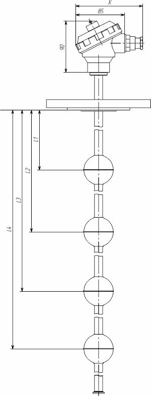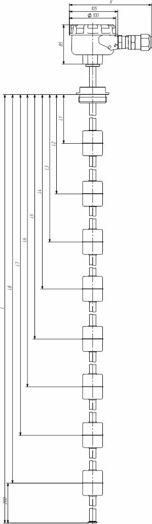 B+С - в стандартном исполнении составляет 230 мм. По согласованию с изготовителем возможно другое. D - диаметр поплавка L - длина ЧЭ L1...L8 - местоположение точек контроля (указываются при заказе) Возможно изготовление сигнализатора с различными типами присоединениями: фланцевое, накидная гайка, штуцерное присоединение, под приварку и др. |