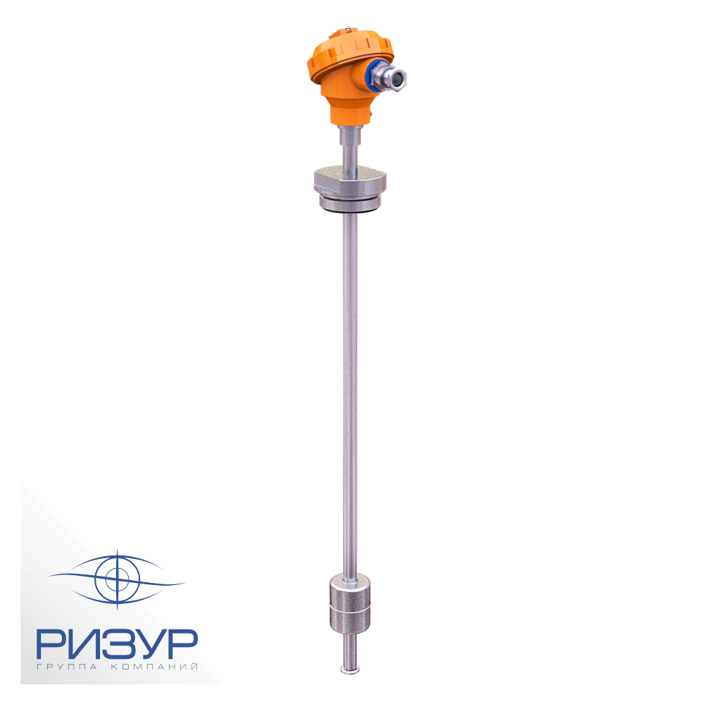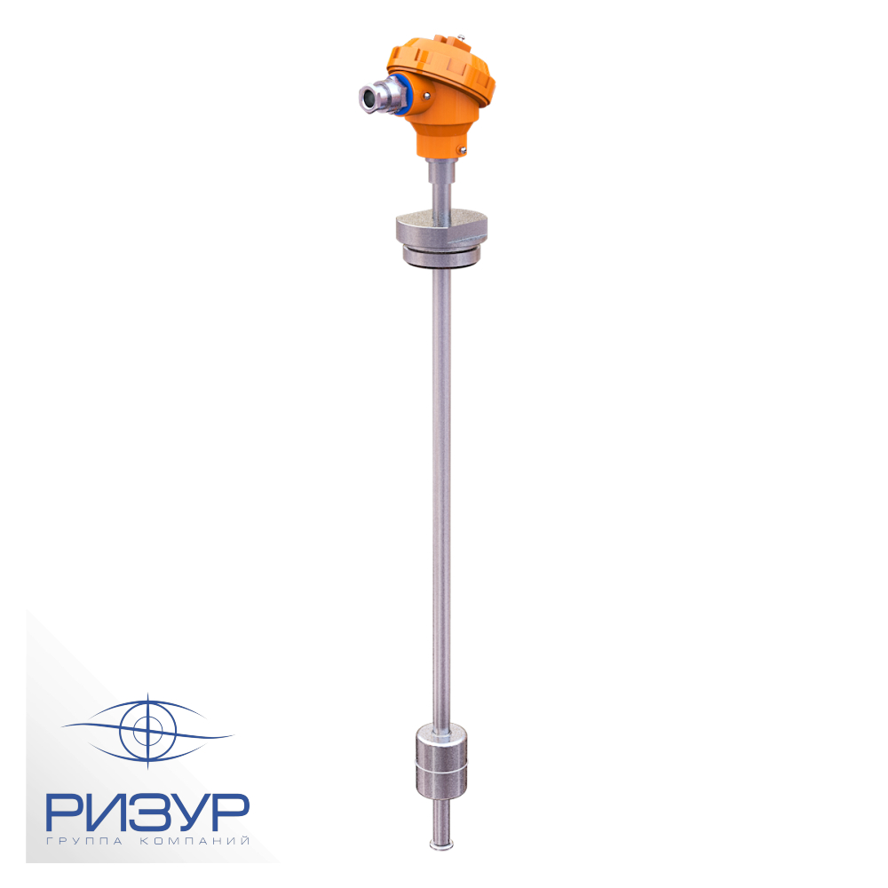 Погружная часть датчика РИЗУР-M-В представляет собой шток, на котором в определенной точке располагается поплавок (или несколько поплавков в разных точках). Ход передвижения поплавка ограничен фиксаторами сверху и снизу. Внутри поплавка находится постоянный магнит, а в штоке, представляющем собой полую трубку, на определенном уровне расположен геркон. При перемещении поплавка на геркон воздействует магнитное поле, что вызывает замыкание/размыкание контрольной цепи.