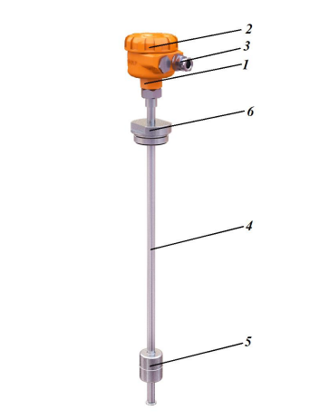Корпус (1) и крышка (2) уровнемера изготовлены из алюминиевого сплава или нержавеющей стали методом литья. Под крышкой размещен клеммный блок для подключения коммутирующего кабеля. Кабель вводится в корпус через кабельный ввод (3) с сальниковым уплотнением.