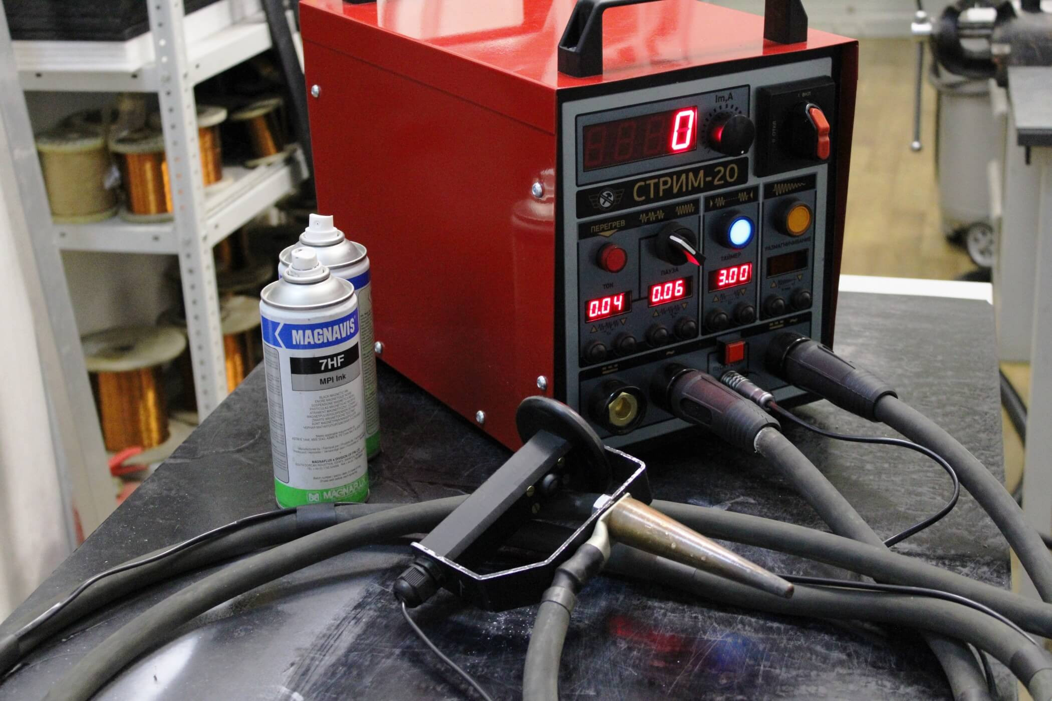 Принцип работы: намагничивание объекта контроля для поиска различных несплошностей с последующим размагничиванием.