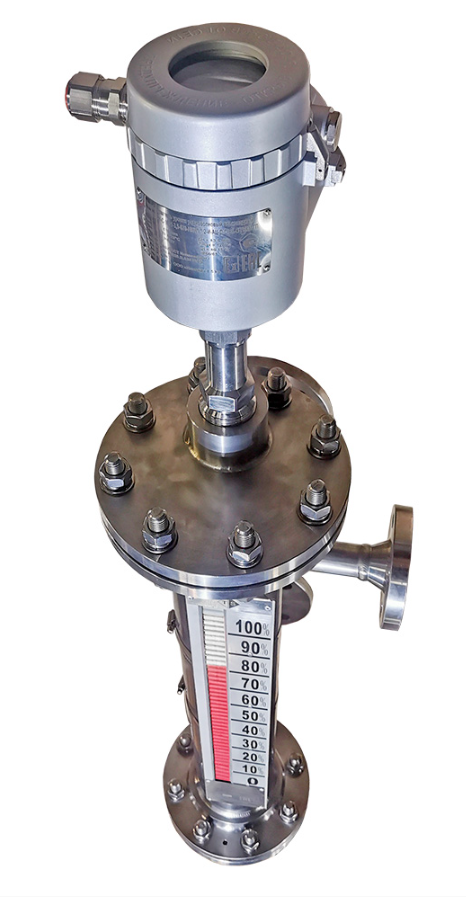 Магнитный уровнемер с комбинированной камерой ТЭК-МПУ-КБ представляет собой камеру увеличенного диаметра (Ду80 или Ду100) с двумя секциями внутри: камерой с поплавковой магнитной системой, обеспечивающей функционирование визуального указателя уровня и камерой для расположения сенсора преобразователя уровня емкостного или рефлекс-радарного принципа измерения.