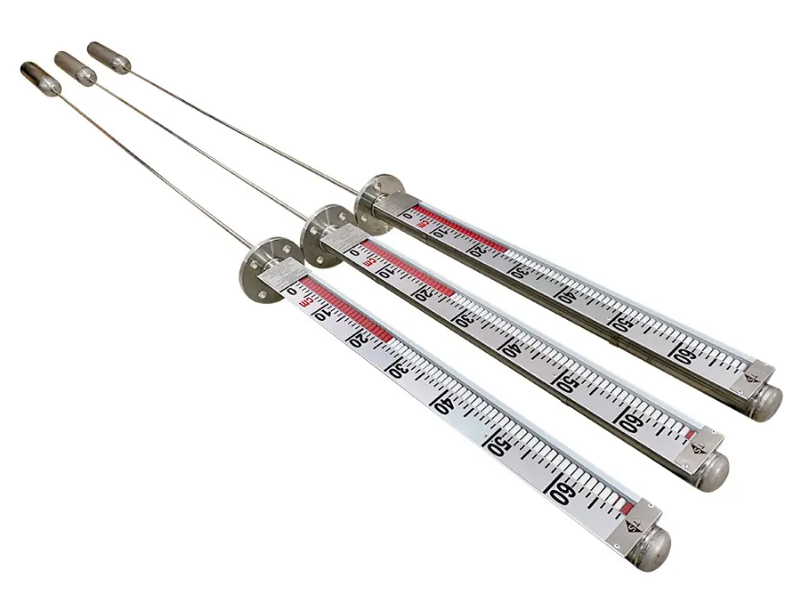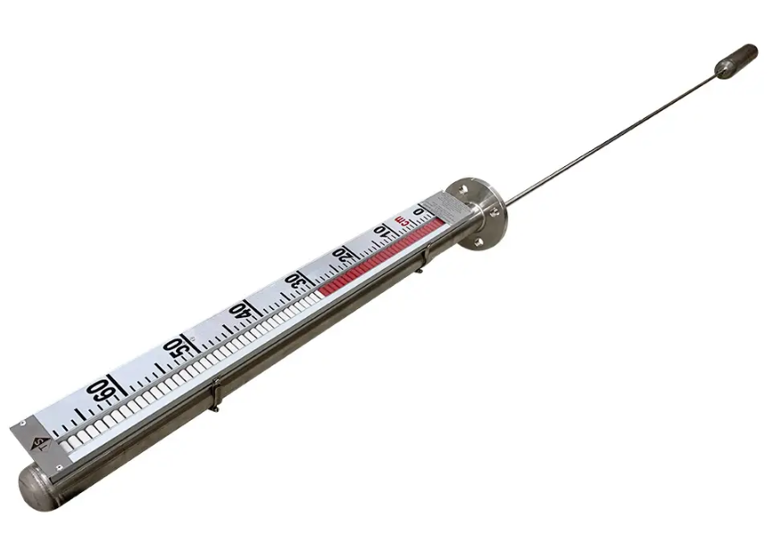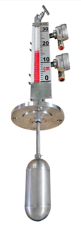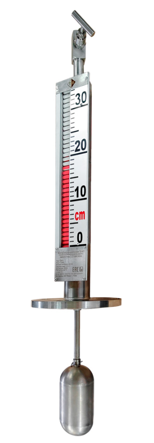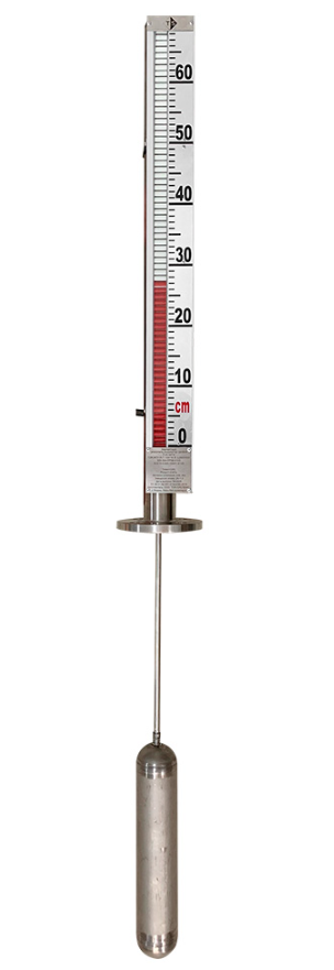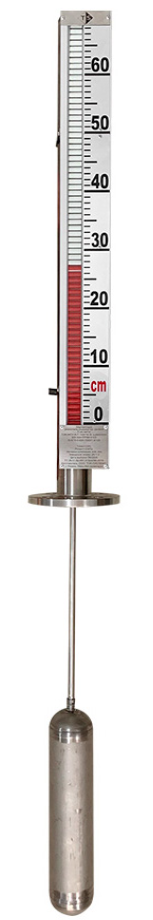 Поплавок имеет шток (длина штока зависит от глубины погружения и диапазона измерения), на противоположном конце которого установлен магнит. При перемещении поплавка в резервуаре происходит перемещение магнита в камере указателя уровня и соответствующее воздействие магнитного поля на систему индикации. Для защиты поплавка и штанги от деформации (при наливе и сильном волнении жидкости) рекомендуется применять волнозащитную трубу.