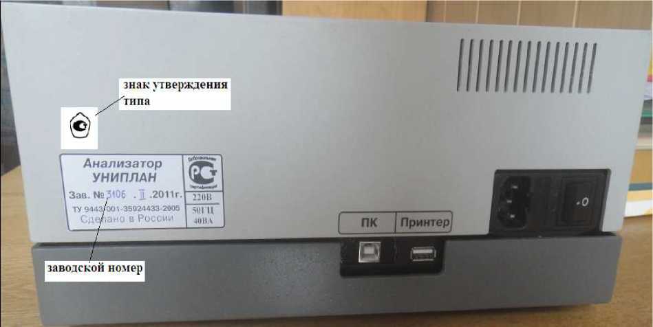 Знак утверждения типа наносится на титульный лист руководства по эксплуатации типографским способом и на заднюю панель анализатора методом наклеивания.