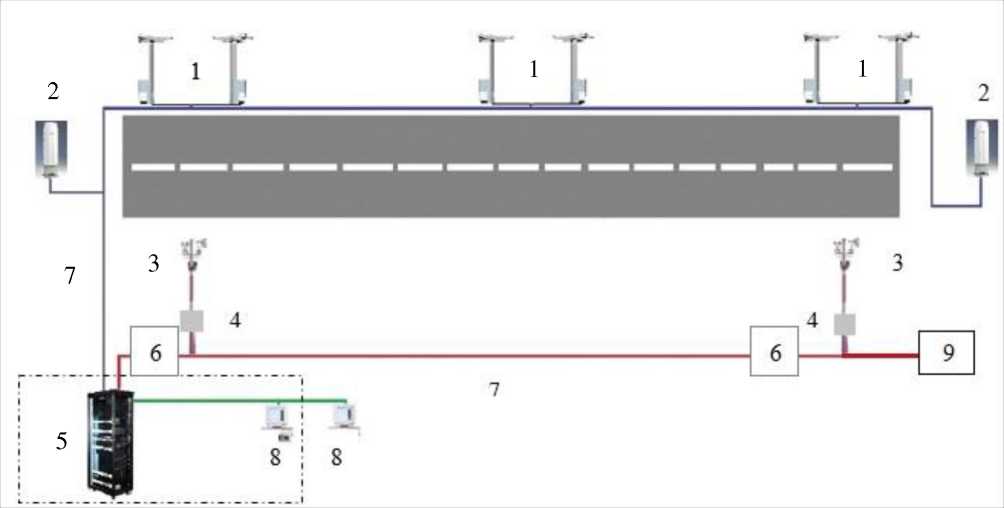 7 - линии связи; 8 - устройства отображения; 9 - автономные блоки: комплексы метеорологические с анемометрами акустическими МК-15, термогигробарометры автоматизированные ТГБА-1