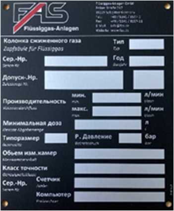 Колонка идентифицируется по типовому шильдику, жестко закрепленному на корпусе колонки (рис.1). На типовом шильдике указаны следующие данные: наименование производителя, наименование изделия, тип колонки, серийный номер, год изготовления, номер допуска, минимальная и максимальная производительность, минимальная доза отпуска, типоразмер по подключению, рабочее давление, объем измерительной камеры (заполняется только для механических объёмомеров), класс точности, серийные номера счётчика и электронного счетного устройства (ЭСУ).