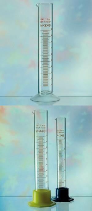 Цилиндры исполнений 1, 3 представляют собой стеклянные цилиндрические трубки разного диаметра, один конец которых запаян в виде дна, а второй, с носиком для слива жидкости, оплавлен. На цилиндры нанесена шкала. Шкала наносится на цилиндры в соответствии с приложением 1 ГОСТ 1770-74. Числовые обозначения шкалы наносятся в восходящем от дна порядке, т.е. число равное номинальной вместимости, указывается сверху.