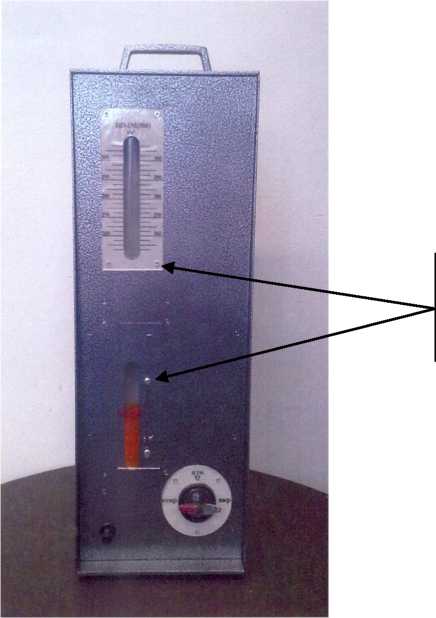 U-образная трубка установлена в закрытом корпусе. В нижней части передней панели корпуса находится входной штуцер и запорный кран, а также два смотровых окна, закрытых стеклами. На верхнем окне установлена шкала с нанесенными на ней рисками и значениями объема. На стекле нижнего окна нанесена риска начального уровня (нониус) жидкости в уравнительном сосуде.