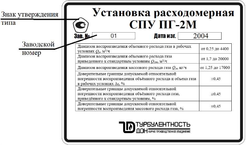 Пломбирование установки расходомерной СПУ ПГ-2М не предусмотрено. Цифровой заводской номер и год выпуска наносится на маркировочную табличку методом лазерной гравировки. Общий вид маркировочной таблички представлен на рисунке 5.