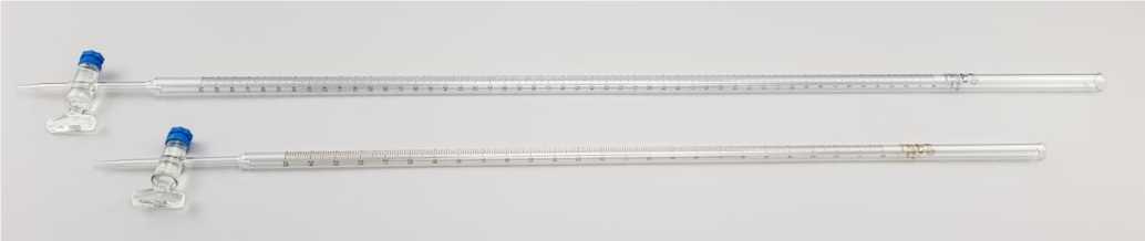 Бюретки тип 1 представляют собой стеклянные цилиндрические трубки с нанесенными на них шкалами.