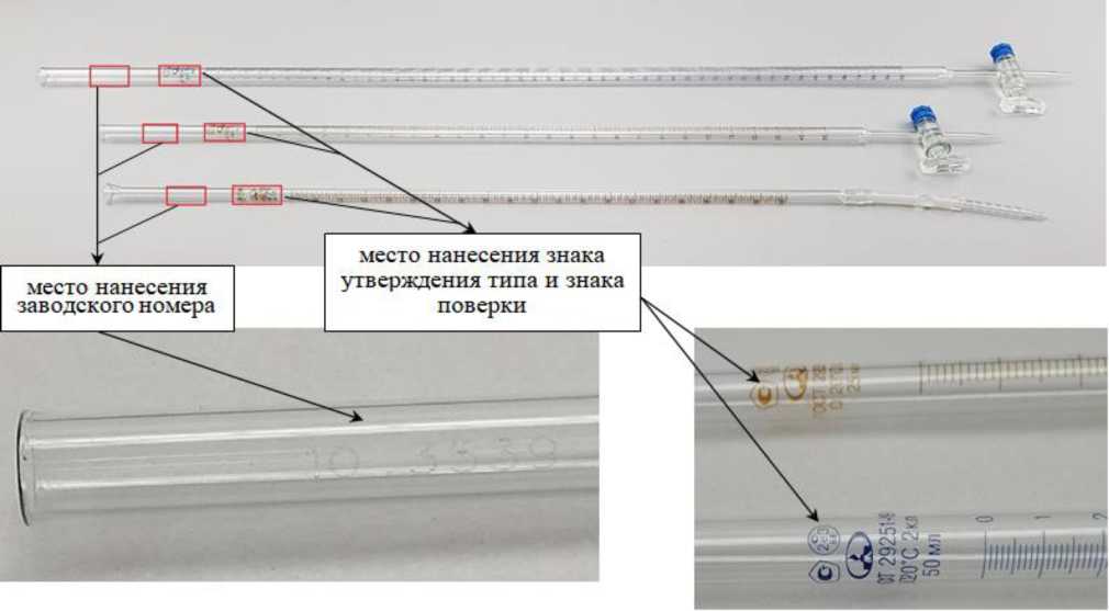 Заводской номер, идентифицирующий каждый экземпляр средства измерений, наносится на верхнюю боковую поверхность бюретки методом лазерной гравировки и имеет цифровое обозначение по системе нумерации изготовителя.