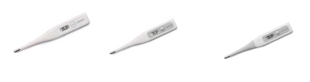 В зависимости от верхнего предела диапазона показаний, нижнего предела диапазона измерений, температуры окружающей среды при эксплуатации, дизайна, габаритным размерам и массе термометры выпускаются в разных исполнениях: OMRON Eco Temp (MC-203-E), OMRON O-Temp-II (MC-204-E), OMRON O-Temp-III (MC-204-E2), OMRON Flex Temp (MC-205-E), OMRON Flex Temp II (MC-206-E), OMRON Eco Temp II (MC-241W-E), OMRON i-Temp (MC-670-E), OMRON i-Temp mini (MC-271W-E), OMRON Eco Temp Basic (МС-246-RU), OMRON Eco Temp Smart (МС-341-RU), OMRON Flex Temp Smart (MC-343F-RU). (далее -MC-203-E, MC-204-Е, MC-204-E2, MC-205-E, MC-206-E, MC-241W-E, МС-670-Е, MC-271W-E, МС-246-RU, МС-341-RU, MC-343F-RU).