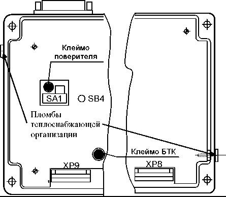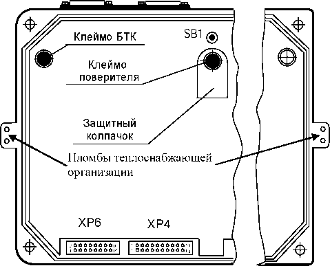 ТМК-Н обеспечены защитой от несанкционированного вмешательства в их работу посредством клеймления и пломбирования защитных крышек. Места нанесения клейм и пломб для различных исполнений тепловычислителей представлены на рисунках 2,3