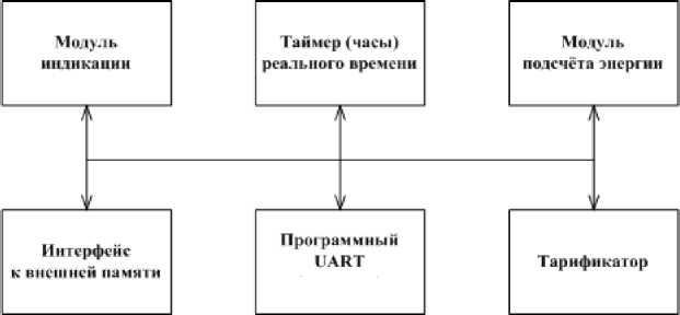 Управление процессом измерения и всеми функциональными узлами счетчика осуществляется высокопроизводительным микроконтроллером (МК), который реализует алгоритмы в соответствии со специализированной программой, помещенной в его внутреннюю память программ. Управление узлами производится через аппаратно-программные интерфейсы, реализованные на портах ввода/вывода МК.