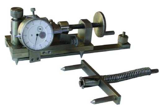 Конструктивно измеритель состоит из плиты, корпуса, со встроенной пружиной, индикатора часового типа, сменных насадок (для определения адгезии битумного и полимерного покрытий). Для выполнения подготовительных работ в комплектность измерителя входят зажим, гайка, прижим, нож, сверло. Внешний вид измерителя представлен на рисунке 1.