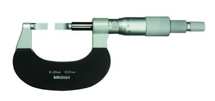 Микрометры серии 122 (рис. 13) имеют ножевидные измерительные поверхности и предназначены для измерения в канавках. Допускаемое отклонение от параллельности измерительных поверхностей этого типа микрометров составляет 3 мкм для моделей с диапазоном измерений до 75 мм, 4 мкм для типоразмеров от 75 до 100 мм, 5 мкм для типоразмеров от 100 до 200 мм и 6 мкм для типоразмеров от 200 до 300 мм.