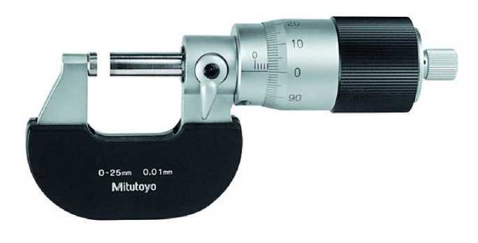 Микрометры нониусные серий 102, 103, 104, 105, 106, 111, 112, 115, 118, 119, 122, 123, 169 (рис. 1) состоят из скобы, снабженной с одной стороны неподвижной измерительной пяткой. С другой стороны в отверстие скобы запрессован стебель, в котором закреплена резьбовая гайка. Микровинт, перемещающийся в резьбе гайки, снабжен на конце второй измерительной пяткой. Для учета осевого перемещения микровинта в целых оборотах служит продольная шкала, интервал деления которой равен шагу микровинта (0,5 мм), указателем для отсчета по этой шкале является торец барабана, закрепленного на микровинте. Для отсчета долей оборота микровинта служит круговая шкала (нониус) с радиальными штрихами, нанесенными на конусной части барабана микрометра. Шкалы на барабане и стебле хромированы. Для обеспечения постоянства измерительного усилия микрометры снабжены специальным механизмом, отрегулированным на определенное усилие поворота или проскальзывания.