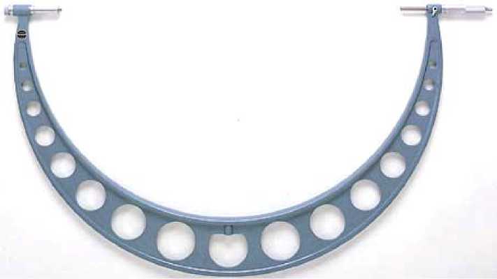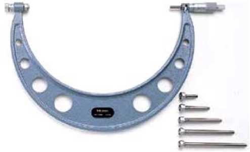 Микрометры нониусные серий 104 (рис. 4) исполнения Outside Micrometers имеют большой диапазон измерений за счет сменных измерительных пяток и изменяются от одного типоразмера к другому ступенчато через 50 или 100 мм. Ход микрометрического винта составляет 25 мм. Допускаемое отклонение от параллельности измерительных поверхностей этого типа микрометров составляет 2 мкм для моделей с диапазоном измерений до 75 мм, 4 мкм для типоразмеров от 75 до 150 мм и (2+L/50) мкм для типоразмеров свыше 150 мм.