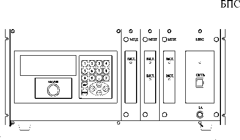 На лицевой БПС расположены: сетевой переключатель «СЕТЬ», индикатор зеленого цвета «ВКЛ», предохранитель «2 А», индикатор зеленого цвета свечения, сообщающий о наличии напряжения питания цепей блока, пленочная клавиатура, цифровой 4-х строчный экран и индикаторы красного цвета свечения П1 (ПОРОГ 1) и П2 (ПОРОГ 2).