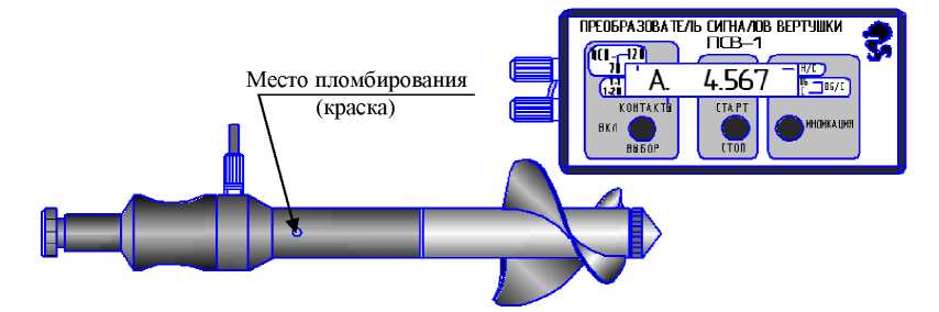Преобразователь ПСВ-1, связанный с выходной цепью вертушки сигнальным проводом, формирует из выходных сигналов вертушки последовательность электрических импульсов, измеряет их частоту следования в соответствии с градуировочной характеристикой лопастного винта, закладываемой в памяти преобразователя, вычисляет значение измеряемой скорости водного потока.