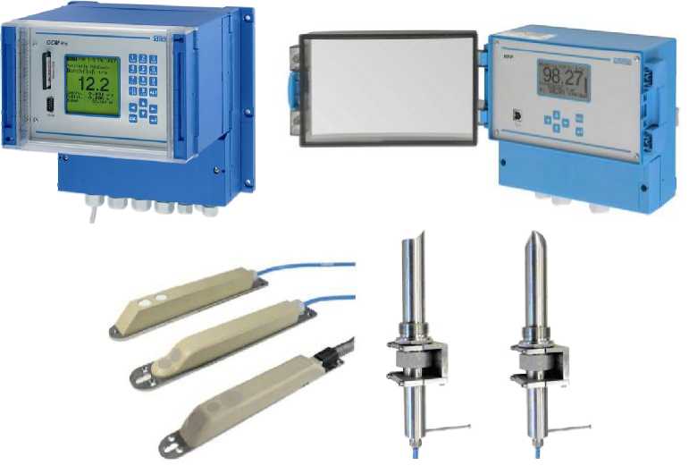 Внешний вид стационарного расходомера OCM Pro (блоки управления, трубный и клиновидный датчики) показаны на рисунке 1 (Примечание: датчики могут иметь и другое исполнение).