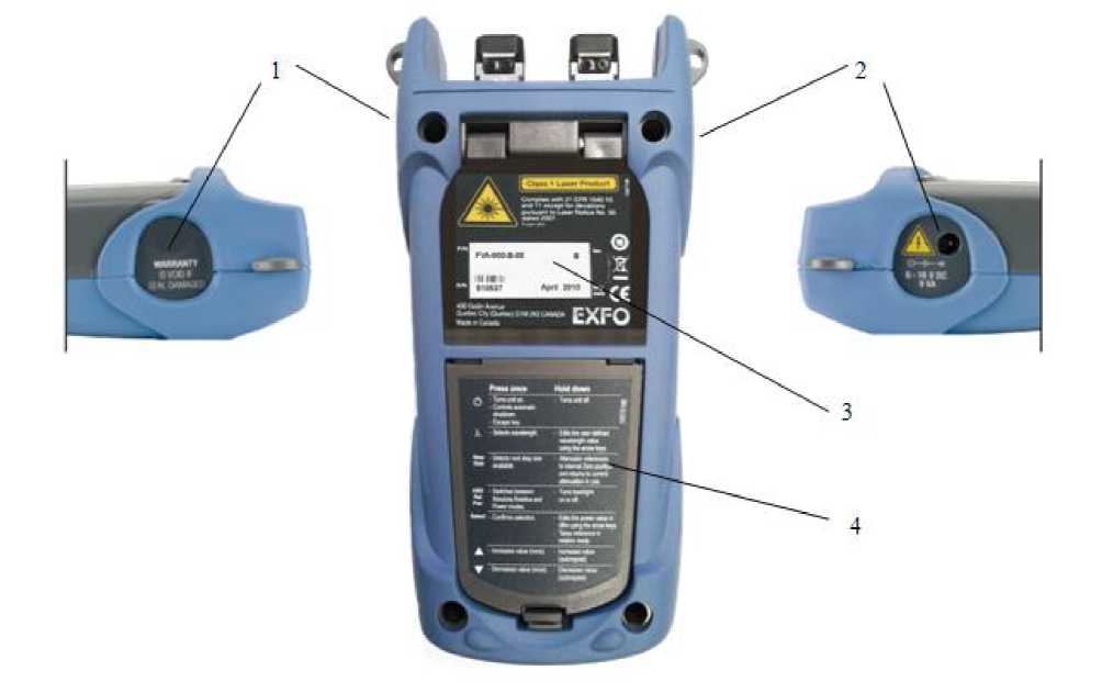 Рисунок 2 - Схема корпуса измерителей оптической мощности PPM-350 (вид сзади/сбоку) 1, 2 - места нанесения защитных наклеек; 3 - место нанесения маркировки (под откидывающейся подставкой); 4 - аккумуляторный отсек.