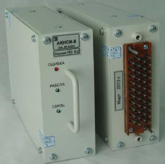 На задней панели установлен коммутационный разъем, с помощью которого производится подключение прибора к источнику питания, входным сигнальным линиям, земляной шине и последовательному каналу передачи данных. Часть контактов коммутационного разъема задействованы для задания сетевого адреса АКНСИ-8 и установки перемычек терминирующих резисторов. С боковых сторон корпус закрывается двумя одинаковыми крышками. Внешний вид устройства показан на рисунке 1.