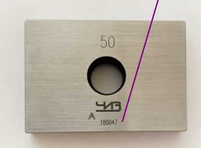 Заводской номер в виде цифрового или буквенно-цифрового обозначения наносится на маркировочную табличку, размещенную на внутренней панели футляра, и/или на отдельные меры методом гравировки. Защитные меры также имеют буквенное обозначение.