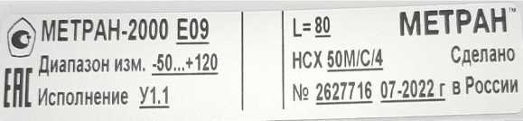 ■д- Диапазон изм. -50...+200 L= 80 Исполнение У1.1 [Hl № 2622103 07-2022 г Сделано в России "л"