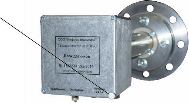 Блок датчиков предназначен для отбора, подготовки и транспортировки анализируемой пробы к измерительным датчикам концентраций, обработки сигналов датчиков и формирования выходного цифрового сигнала, содержащего информацию об измеряемых компонентах и о функциональном состоянии основных элементов блока датчиков. Сигналы от датчиков поступают в многоканальный аналого-цифровой преобразователь, обрабатываются микроконтроллером, после чего рассчитанные значения концентраций выводятся на последовательный цифровой порт RS-485 для передачи на внешнее устройство индикации и управления. Блок датчиков включает в себя пробоотборный зонд с крепежным фланцем. Зонд представляет из себя трубку из нержавеющей стали, на погружаемом конце которого сделан срез под углом 45 °, обеспечивающий заход пробы в зонд и ее транспортировку к газовым сенсорам. Длина зонда определяется потребителем в зависимости от размеров дымохода и условий эксплуатации.