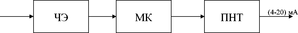 Измеряемое давление воспринимается чувствительным элементом (ЧЭ) и преобразуется в пропорциональные электрические сигналы. Сигналы с выхода ЧЭ поступают в микроконтроллер (МК), где происходит вычисление и формирование выходного сигнала. Преобразователь напряжение-ток (ПНТ) преобразует сигнал с микроконтроллера (МК) до стандартного значения (4-20) мА.