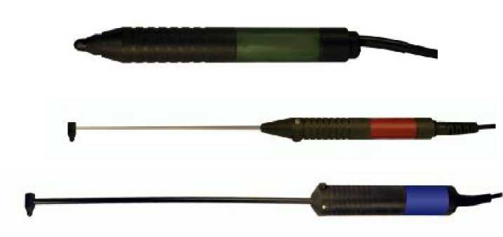 ПФ-Г2-4-Т - для обнаружения поверхностных трещин малой протяженности на объектах из титановых сплавов, неферромагнитных коррозионно-стойких сталей и других сплавов с электрической проводимостью от 0,4 до 2,1 МСм/м, Г-образный, миниатюрный с тонкой, легко гнущейся трубкой.