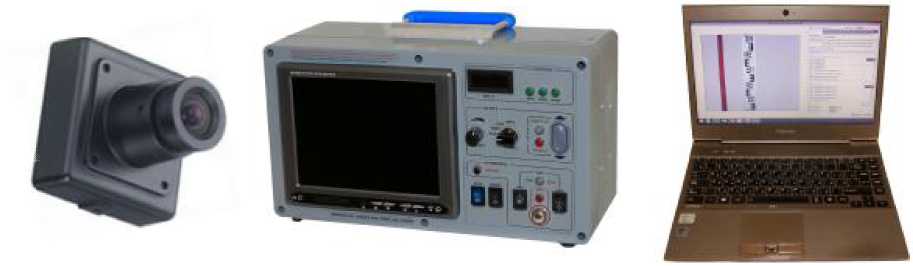 Рисунок 1 - Общий вид Измерителей линейных размеров телевизионных ИРТ-29 (слева направо - Телекамера, Блок управления, Ноутбук с программным комплексом)