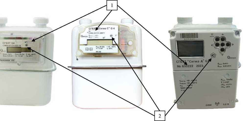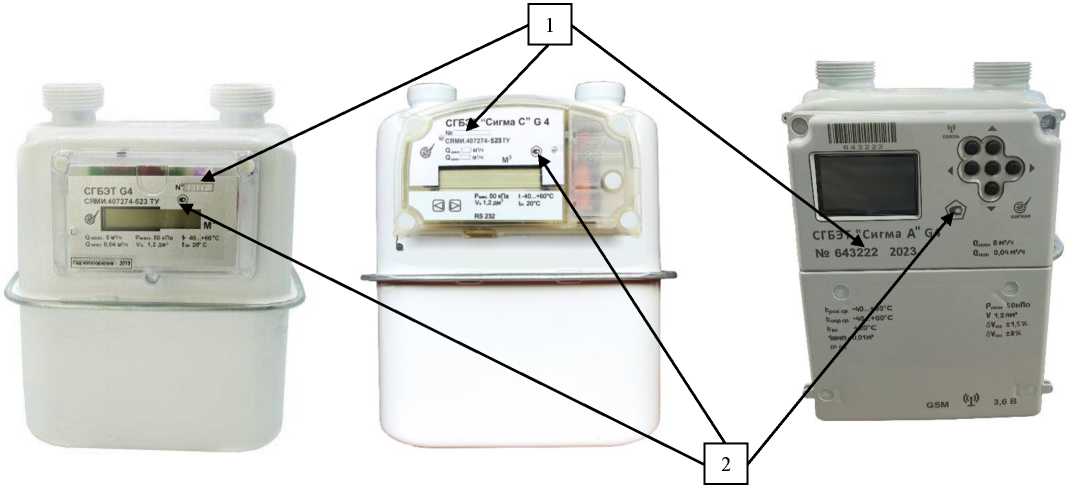 На рисунке 1 приведен общий вид счётчиков газа бытовых модификаций СГБЭТ и СГКЭТ, исполнений СГБЭТ «Сигма А» и СГБЭТ «Сигма С». Также на рисунке 1 обозначены места нанесения заводского номера и знака утверждения типа.