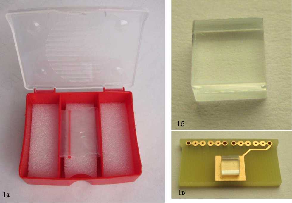 Рисунок 1 - Фото меры рельефной Кварц-ХУ1400//90нм в футляре (1а), отдельно (1б) и на столике микроскопа сканирующего зондового СММ-2000 (1в)