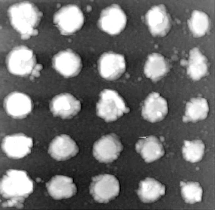 Подложка (кварцевая пластина) имеет форму прямоугольного параллелепипеда с размерами 5 мм х 5 мм х 2.2 мм. Периодические выступы выполнены из хрома. Кадр рабочей поверхности меры приведен на рис. 2.