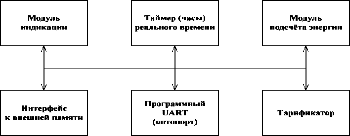 обмен информацией с компьютером в соответствии с протоколом обмена. Кроме данных об учтённой электроэнергии в энергонезависимой памяти хранятся калибровочные коэффициенты, тарифное расписание, серийный номер, версия программного обеспечения счётчика и другая информация, необходимая для конфигурации счетчика.