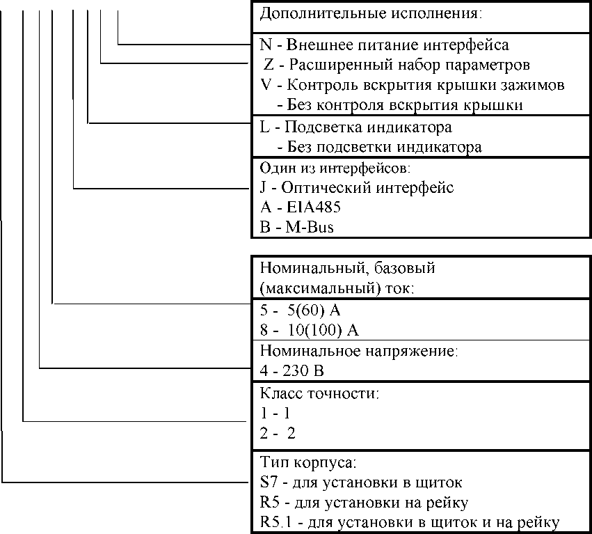 В состав счетчиков, в соответствии со структурой условного обозначения, приведенной на рисунке 1, могут входить дополнительные устройства: интерфейса, контроля вскрытия крышки зажимной колодки и хранения профилей нагрузки.