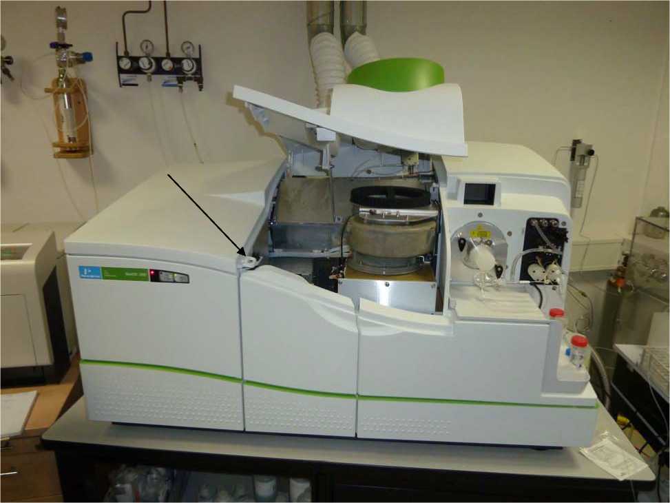 На масс-спектрометрах отсутствует пломбировка, но данные приборы имеют датчики блокировки, расположенные под крышкой прибора (месторасположение блокировки показано на рисунке 2 стрелкой). При открывании крышки прибора датчики срабатывают, и включение прибора становится невозможным.