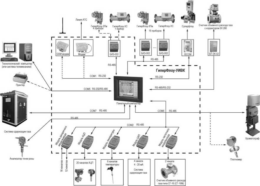 Коммуникаторы "ГиперФлоу-УИВК" относятся к проектно-компонуемым изделиям (состав оборудования определяется опросным листом) и их измерительные каналы (ИК) обеспечивают считывание, обработку, хранение и передачу на верхний уровень данных со следующего оборудования: датчиков комплексных с вычислителем расхода "ГиперФлоу-3Пм" (Госреестр № 15646-08), комплексов "Суперфлоу-ПЕ" (Госреестр № 12924-08), "Су-перфлоу-IIET" (Госреестр. № 12924-08), "Суперфлоу-21В" (Госреестр № 23120-07), счетчиков объемного расхода газа СГ-16 (СГ-16М) (Госреестр № 14124-09), корректоров объема газа ЕК-260 (Госреестр. № 21123-08), анализаторов точки росы "КОНГ-Прима-10" (Гос-реестр. № 28228-10), плотномера проточного ПЛОТ-3М (Госреестр № 20270-07), поточного хроматографа DANI PGC 90.50 (Госреестр № 14604-10), датчиков с токовым выходом 4-20 мА (преобразователи давления измерительные Метран 3051 (Госреестр № 14061-10), измерительный преобразователь Метран-950 (Госреестр № 42793-09), датчиков с частотным выходом, датчиков с дискретным выходом, датчиков температуры (термометры сопротивления типа ТСМ 9418, ТСП 9418 (Госреестр № 15196-06) и другого оборудования, имеющего интерфейс RS-232 или RS-485.