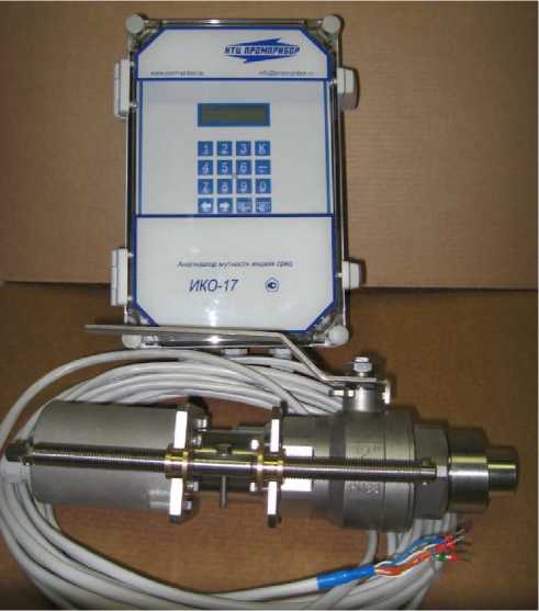 Конструктивно анализаторы ИКО-17 выполнены в виде двух блоков: оптического датчика и электронного блока (рис. 1). Для установки в места эксплуатации предусмотрен шаровой кран, предназначенный для крепления оптического датчика на трубопроводе. Для проведения измерений в жидкостях с низкой концентрацией частиц предусмотрено использование зеркальной насадки, увеличивающей долю отражённого от взвешенных в жидкости частиц излучения.