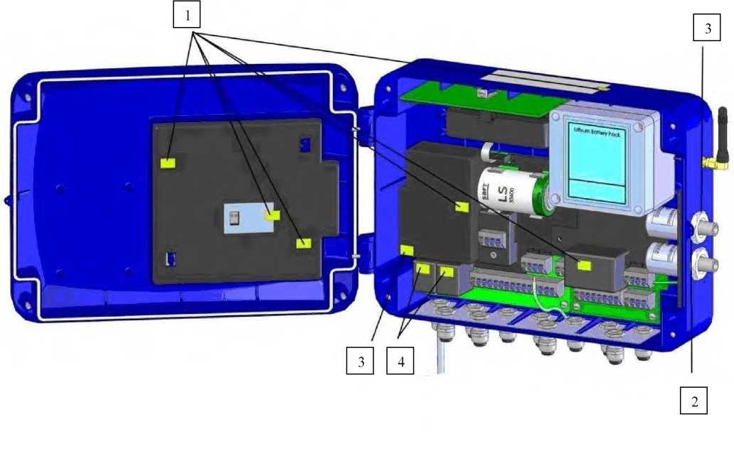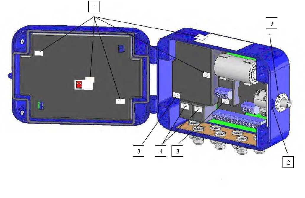 Рис. 4. Места нанесения поверительных пломб и наклеек внутри корректоров miniELCOR.
