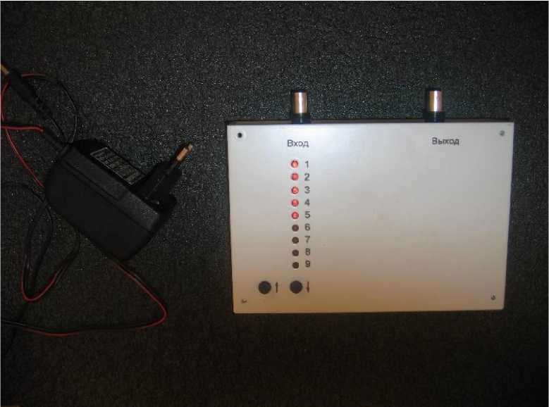 В корпусе размещены пять стандартных твердотельных линий задержки с сосредоточенными параметрами типа ЛЗТ-4.0-1200 и одна типа ЛЗЕ-0.2-1200, входной и выходной усилители DA1 типа AD828AR, мультиплексор DD1 - DD2. На лицевой панели корпуса расположены девять светодиодов, с нанесенными рядом с ними цифрами от 1 до 9, определяющими диапазон измерений, и две кнопки управления. Свечение одного из светодиодов является индикатором наличия питания ЛЗТ-2.