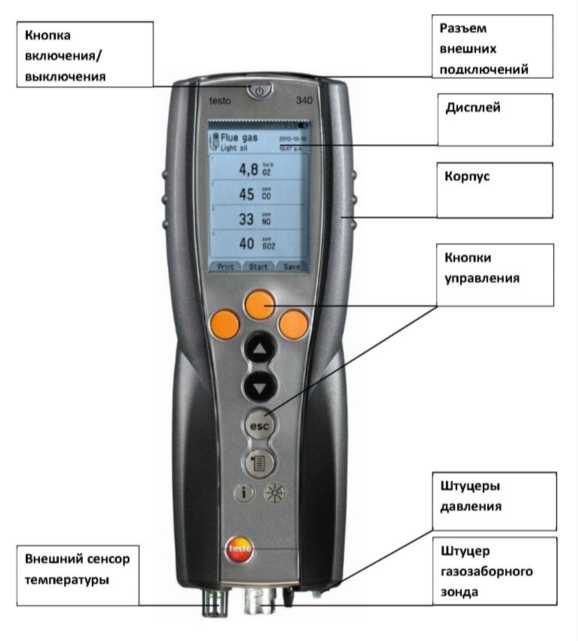 Анализатор дымовых газов Testo-340 собран в корпусе из пластика, имеет жидкокристаллический дисплей и клавиатуру на передней панели.