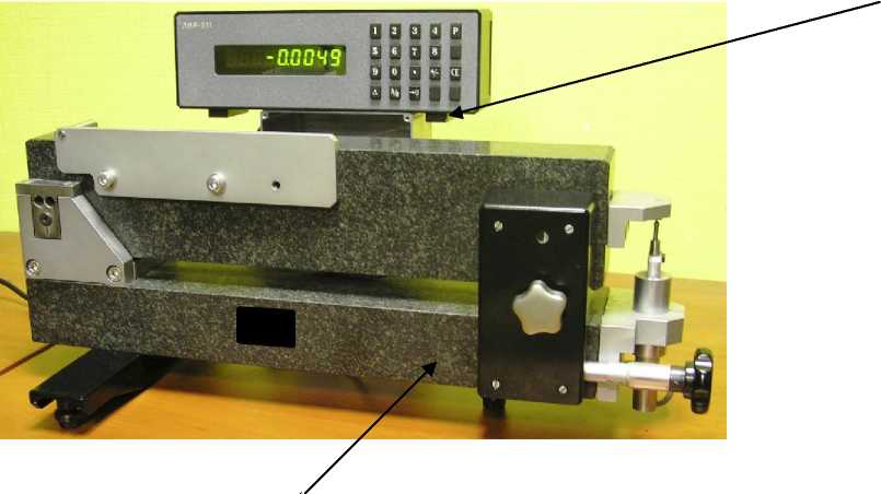 На столе закреплена планка для ограничения положения поверяемых объектов. Устройство цифровой индикации (УЦИ) предназначено для обработки электрических сигналов, поступающих от оптоэлектронного преобразователя линейных перемещений, и осуществляет визуализацию на цифровом табло полученной информации.