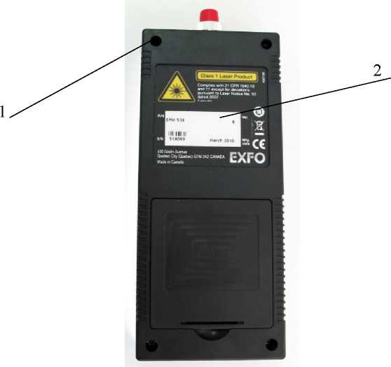 Рисунок 2 - Корпус ваттметра/источника тестера - вид сзади, защитный кожух снят 1 - место установки пломбы; 2 - место нанесения маркировки