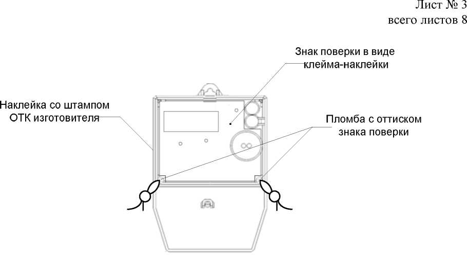 Схема пломбирования счетчиков для защиты от несанкционированного доступа к элементам регулировки с указанием места навесных пломб с оттиском знака поверки и наклейки с штампом ОТК изготовителя, а также нанесения знака поверки в виде клейма-наклейки, приведена на рисунках 4 и 5.