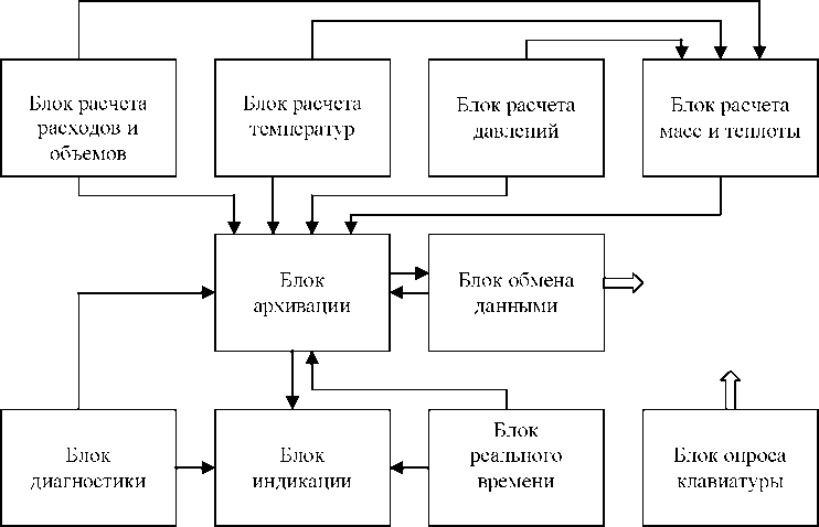 1) Блок расчета расходов и объемов предназначен для расчетов их значений по результатам измерений выходных сигналов расходомеров;